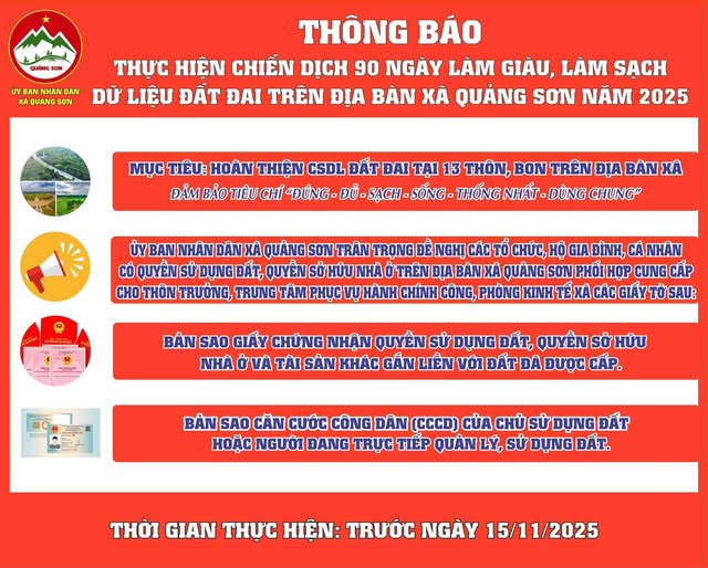 Trang chủ Thông báo Thực hiện cao điểm 90 ngày làm giàu, làm sạch dữ liệu đất đai trên địa bàn xã Quảng Sơn  06/11/2025 11:16 |   54 |  Thực hiện cao điểm 90 ngày làm giàu, làm sạch dữ liệu đất đai trên địa bàn xã Quảng Sơn
