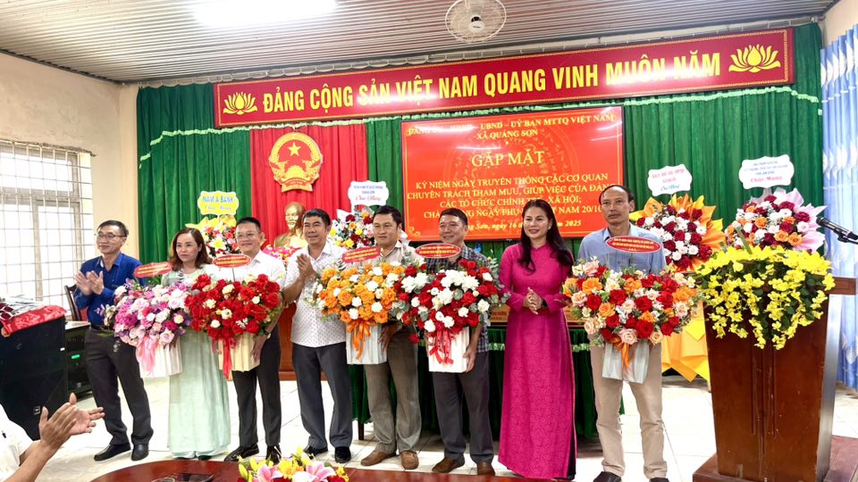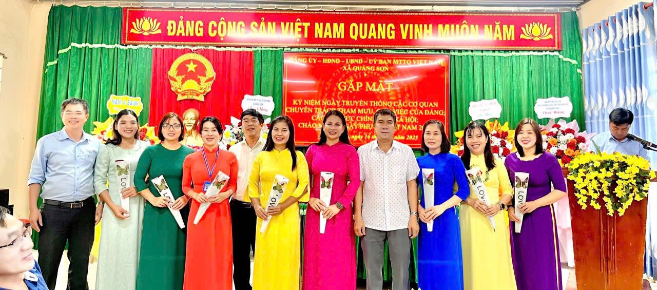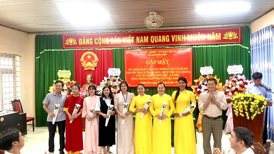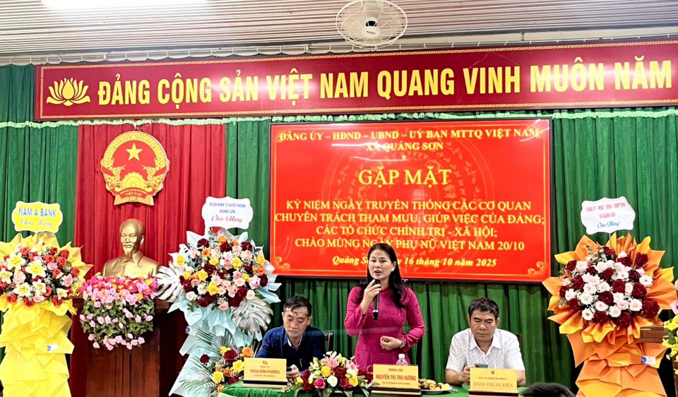 Tin tứcChính quyền Kỷ niệm Ngày truyền thống các cơ quan chuyên trách tham mưu, giúp việc của Đảng, các tổ chức chính trị - xã hội và chào mừng Ngày Phụ nữ Việt Nam 20/10 Your browser does not support the audio element.   17/10/2025 09:33 |   25 |  Chiều ngày 16/10, tại Hội trường UBND xã, Đảng uỷ, UBND, UBMTTQVN xã Quảng Sơn tổ chức buổi gặp mặt kỷ niệm Ngày truyền thống các cơ quan chuyên trách tham mưu, giúp việc của Đảng, các tổ chức chính trị - xã hội và chào mừng Ngày Phụ nữ Việt Nam 20/10. Chiều ngày 16/10, tại Hội trường UBND xã, Đảng uỷ, UBND, UBMTTQVN xã Quảng Sơn tổ chức buổi gặp mặt kỷ niệm Ngày truyền thống các cơ quan chuyên trách tham mưu, giúp việc của Đảng, các tổ chức chính trị - xã hội và chào mừng Ngày Phụ nữ Việt Nam 20/10. Về dự buổi gặp mặt có đồng chí Nguyễn Thị Thu Hường – Tỉnh uỷ viên, Bí thư Đảng uỷ xã Quảng Sơn. Đồng chí đã gửi tới toàn thể cán bộ, công chức, viên chức, đoàn viên, hội viên và đặc biệt là các đồng chí nữ nhân ngày 20/10 những lời chúc mừng tốt đẹp, sâu sắc nhất. Buổi gặp mặt diễn ra trong không khí ấm áp, đoàn kết, thể hiện sự quan tâm của cấp uỷ đối với đội ngũ cán bộ, đảng viên và các tổ chức chính trị - xã hội, góp phần củng cố tinh thần trách nhiệm, gắn bó, chung sức xây dựng Đảng và hệ thống chính trị vững mạnh.