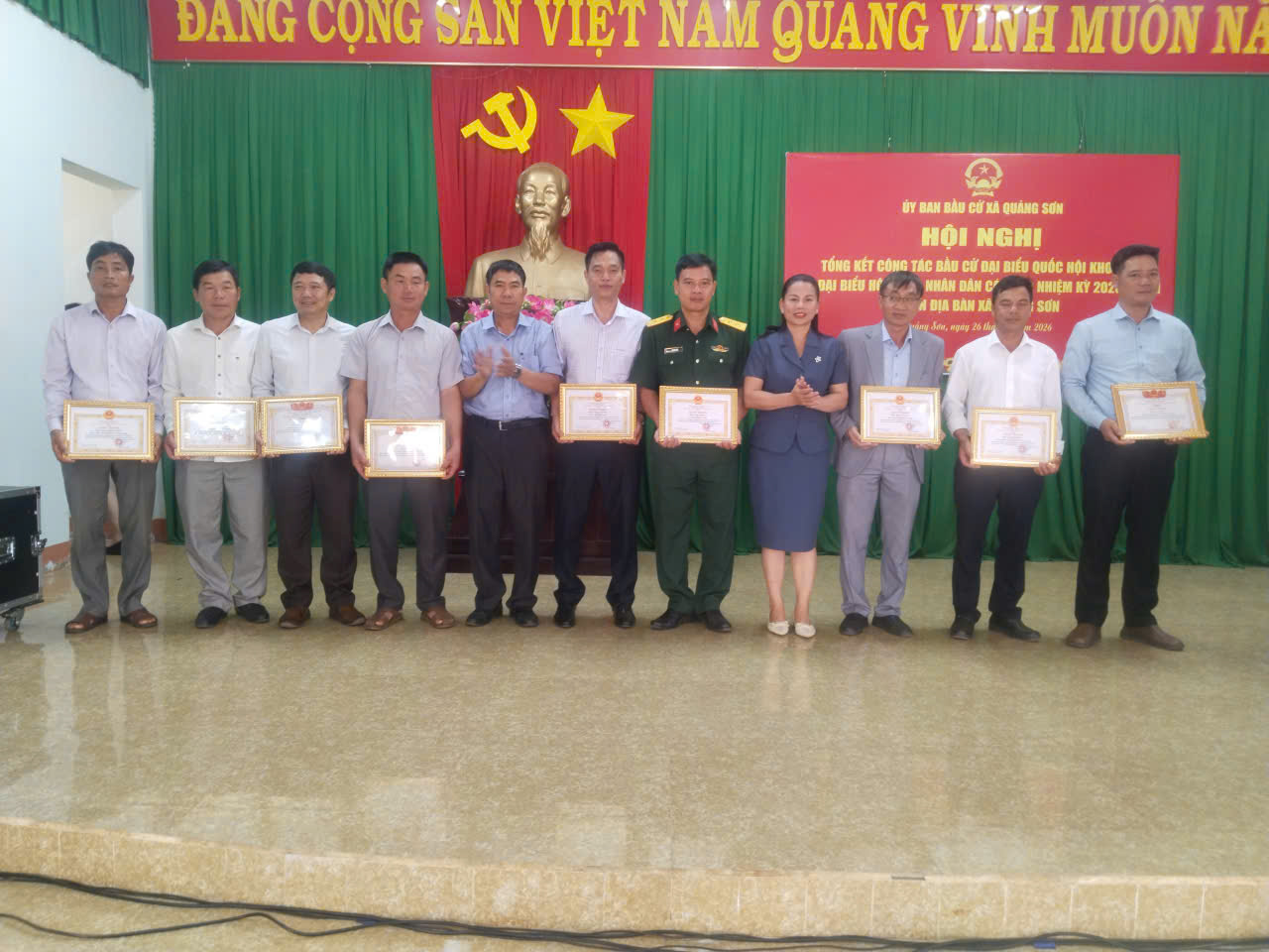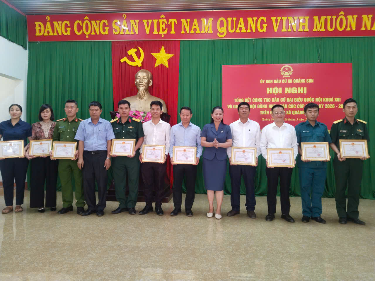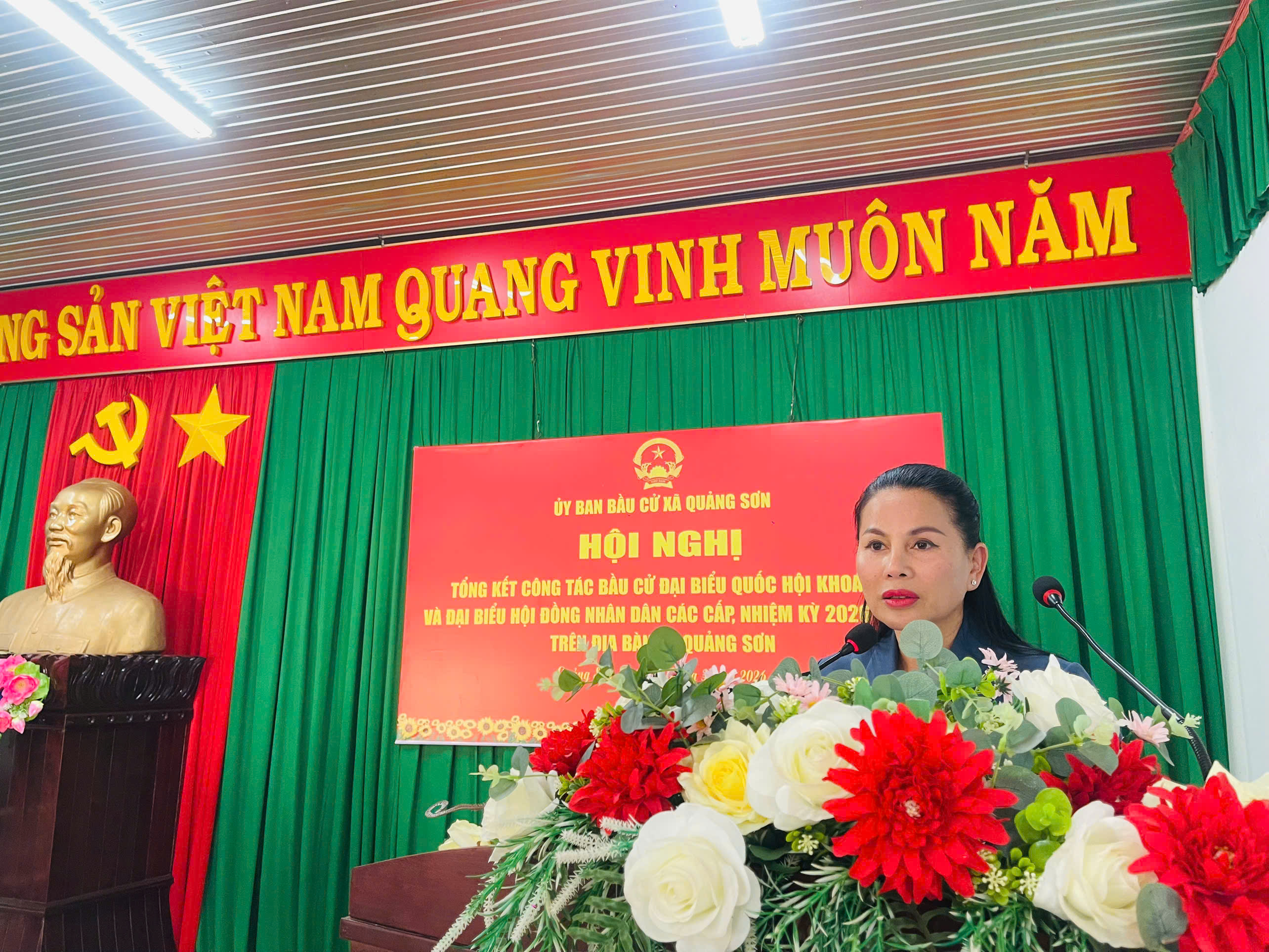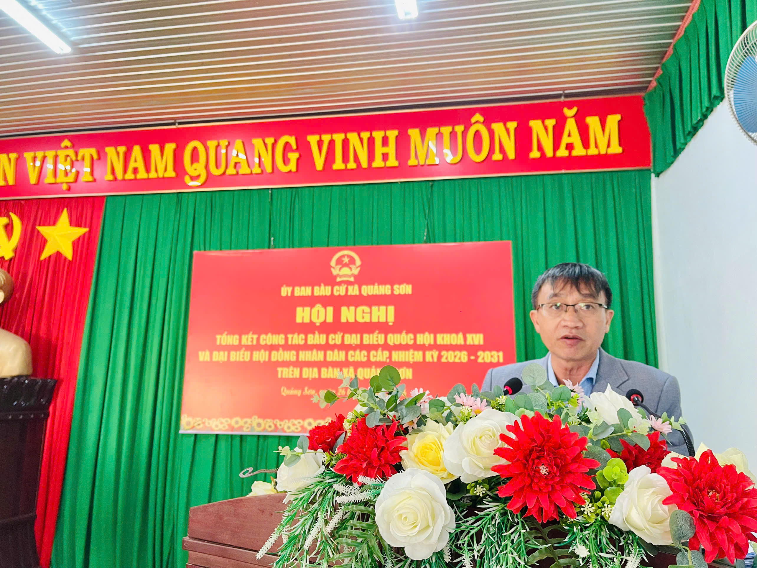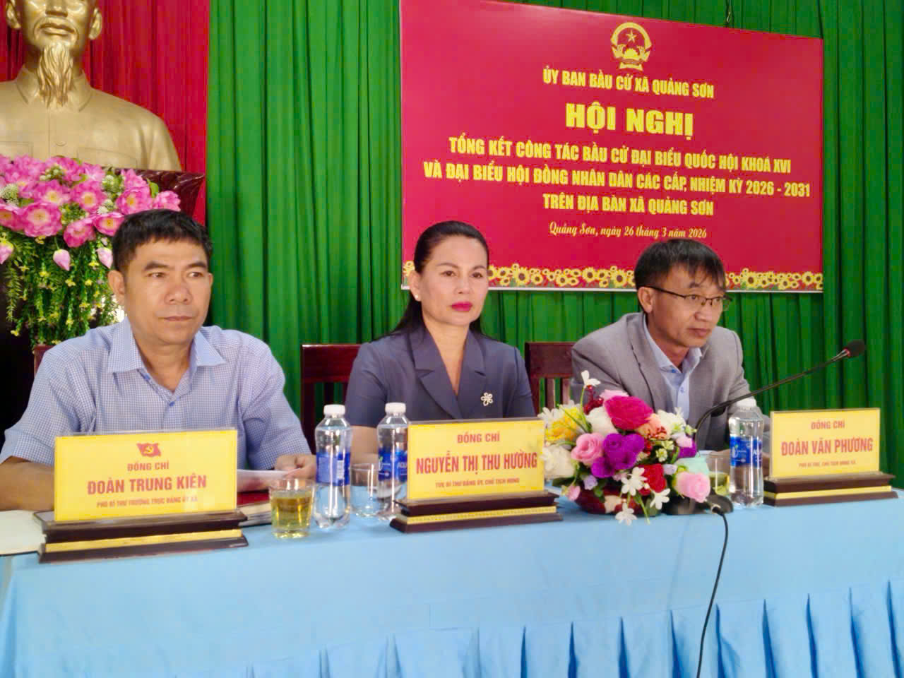 Sáng 26/3, Ủy ban Bầu cử (UBBC) xã Quảng Sơn tổ chức hội nghị tổng kết công tác bầu cử đại biểu Quốc hội (ĐBQH) khóa XVI và đại biểu HĐND các cấp, nhiệm kỳ 2026-2031 trên địa bàn xã Quảng Sơn. Các đồng chí: Nguyễn Thị Thu Hường, Tỉnh ủy viên, Bí thư Đảng ủy, Chủ tịch HĐND xã, Trưởng Ban Chỉ đạo công tác bầu cử xã; Đoàn Trung Kiên, Phó Bí thư Thường trực Đảng ủy, Phó Trưởng Ban Thường trực Ban Chỉ đạo công tác bầu cử xã; Đoàn Văn Phương, Phó Bí thư Đảng ủy, Chủ tịch UBND xã, Chủ tịch Ủy ban bầu cử xã cùng chủ trì hội nghị.